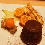 Al contener chocolate fundido se me ocurrió la idea de combinarlo con unas frutas tropicales para que se como a modo de “Foundeé de chocolate”. La combinación de los plátanos, las fresas y algunas otras cosas con el chocolate fundido es fantástica y en este caso nos decidimos por unos Bananitos, pequeños y delicados plátanos, Carambola con su exótico y delicado dulzor y su fresca textura, un toque de cítricos de justa acidez como los Kumquat y una dulce y preciosa Capulina que a modo de flor decoraba el plato.