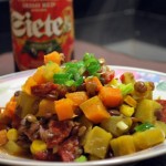 · El tamaño en que están cortados los cubos de batata y calabaza, y la panceta y el chorizo colorado, responde a que en cada cuchara del guiso que lleves a tu boca tenga cantidad pareja de esos ingredientes. ¿La tenías esa?, no es de maniático, queda bueno, probá,